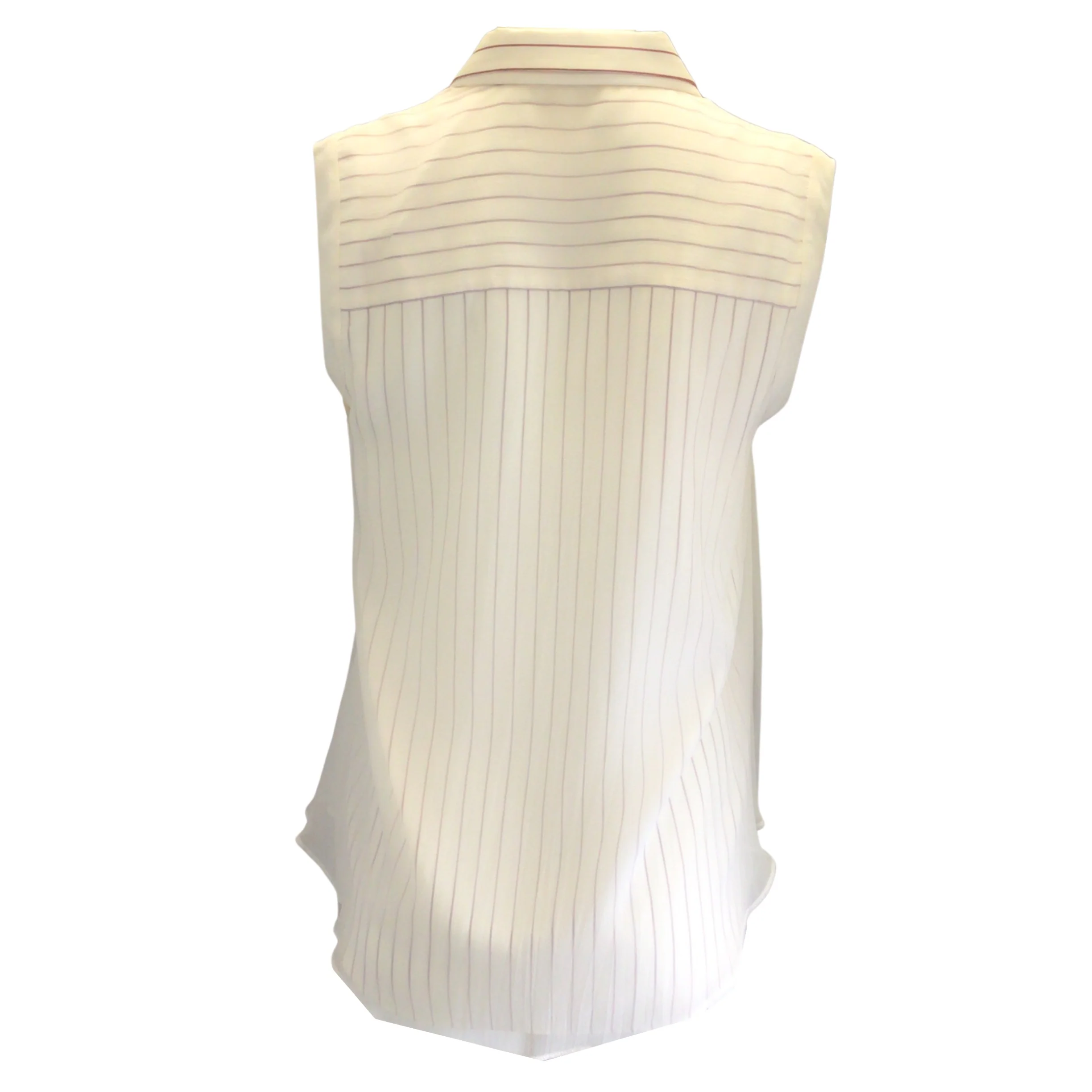Description: Brunello Cucinelli Ivory / Burgundy Striped Sleeveless Button-down Silk Top with chiffon overlay. Style number XMA928N9306 CR227.