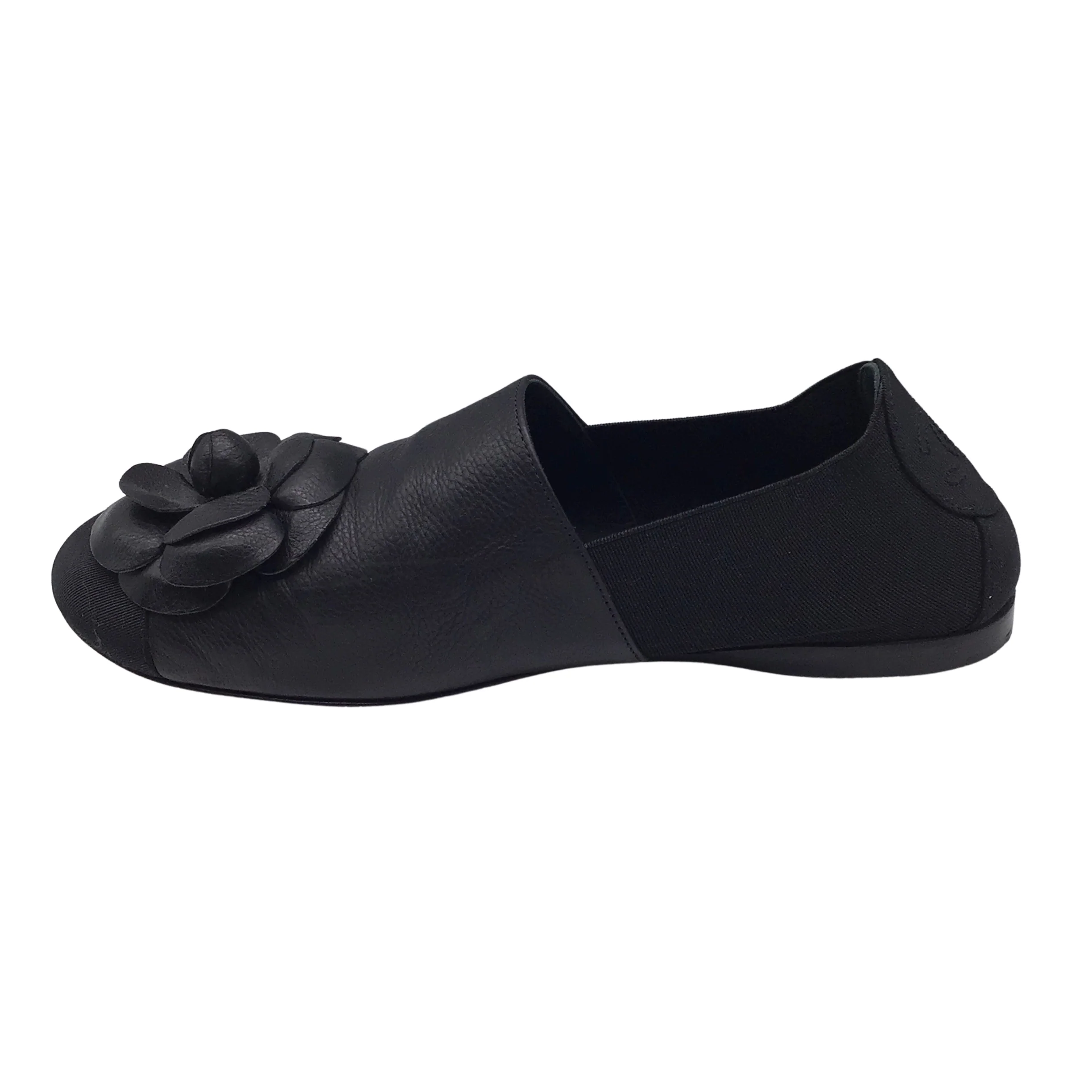 Chanel Black Camellia Leather and Grosgrain Loafers / Flats