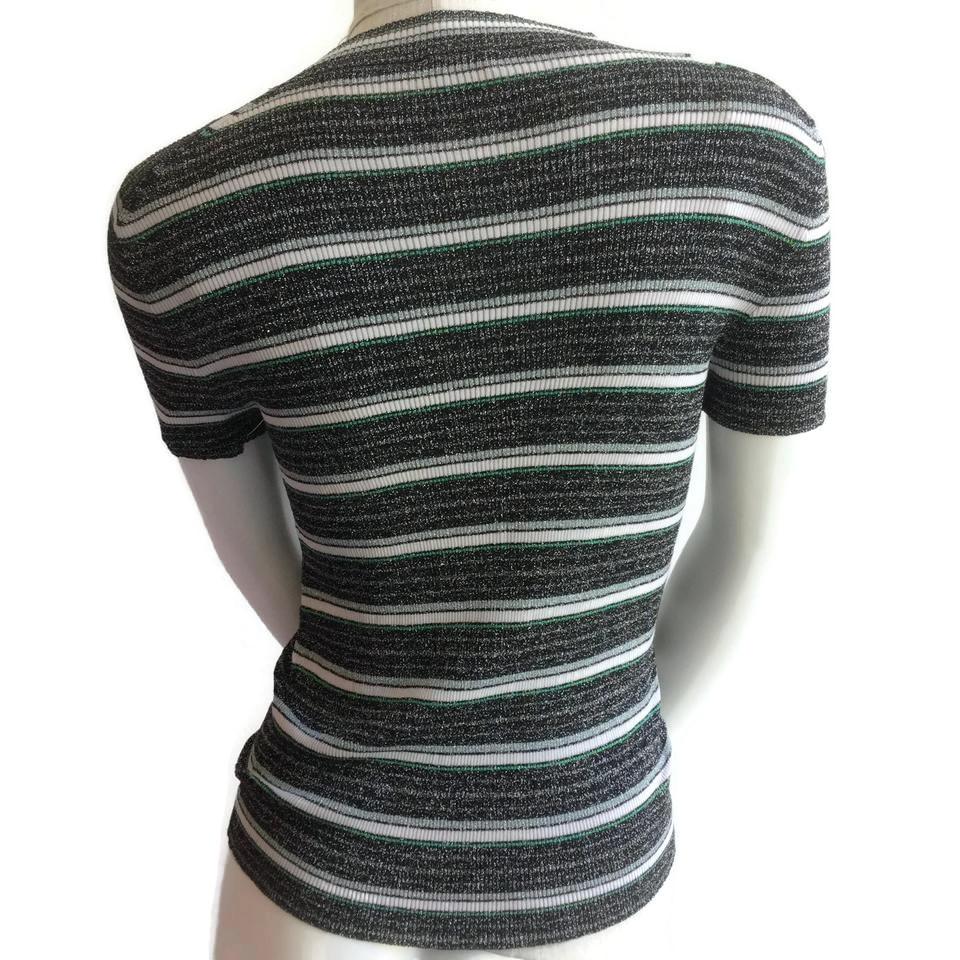 Horizontal stripes of light grey, green and white set against a shimmery dark gray make this Chanel tee-shirt the simple standout piece that it is! Features a high, rounded neck, and ripped sleeves and bottom for a fitted look. Chanel insignia bottom right.Â