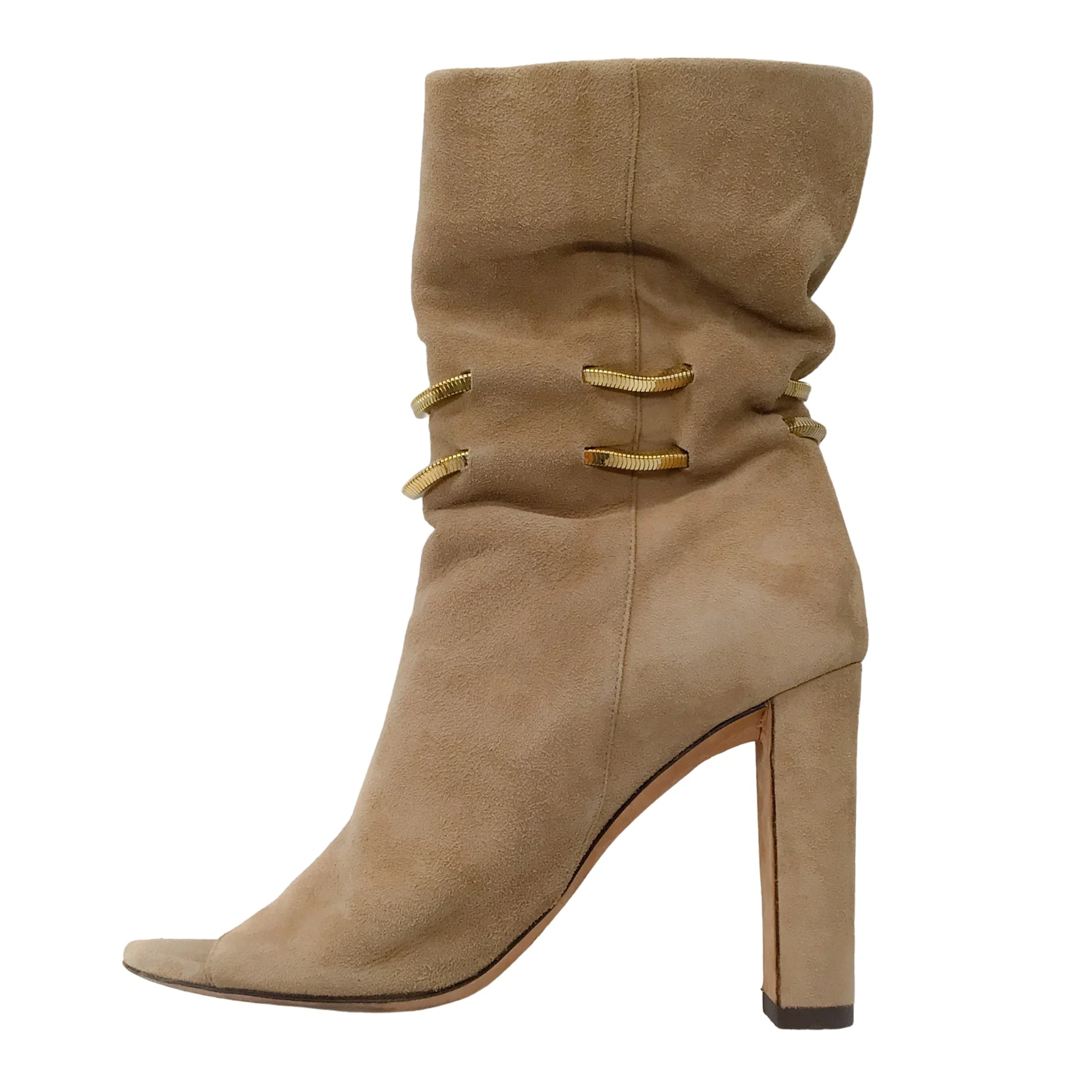 Description: Jimmy Choo Beige Mysen 100 Open Toe Suede Boots.