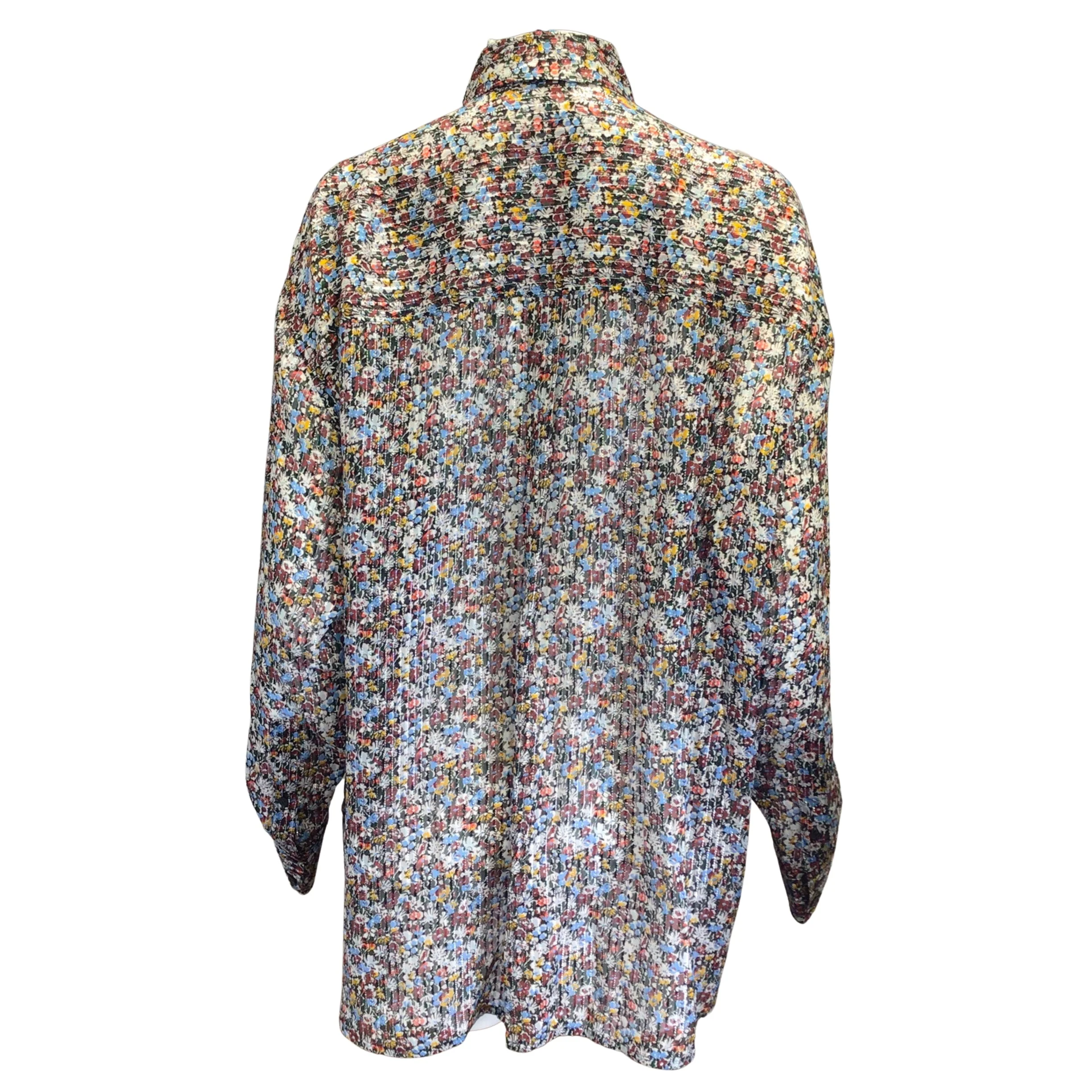 Description: Victoria Beckham Black / Manchester Blue Multi Floral Lurex Stripe Oversized Silk Shirt.